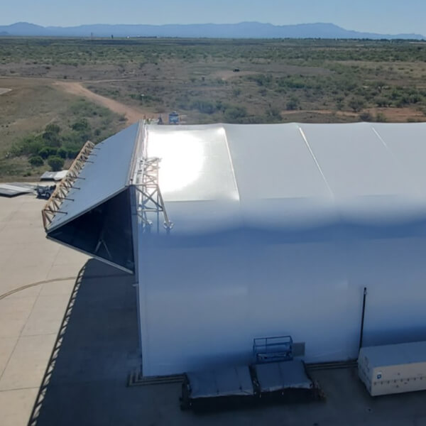 In the mid-2000’s, the Department of Homeland Security purchased two large hangars for usasge as drone hangars for the the US Border Patrol for intstallation at Ft. Huachuca, very close to the Mexican Border. The structures featured large, custom hangar doors that were integrated into the design of the structures themselvesUnfortunately, when it came time to refurbish the exterior membranes, the company from whom they purchased the structures had gone out of business. They needed a company that had expertise in providing membrane refurbishment services for any structure, regardless of OEM that could handle the custom design elements